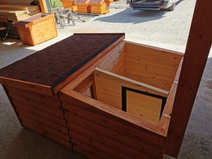 Unsere isolierten Hundehütten halten im Innenraum eine Temperatur, die im Vergleich zur Außentemperatur um 5–12 °C angenehmer ist.